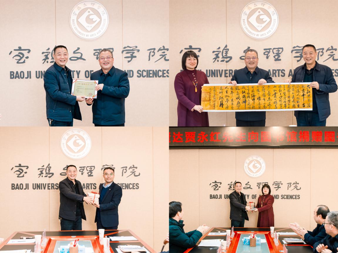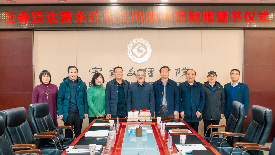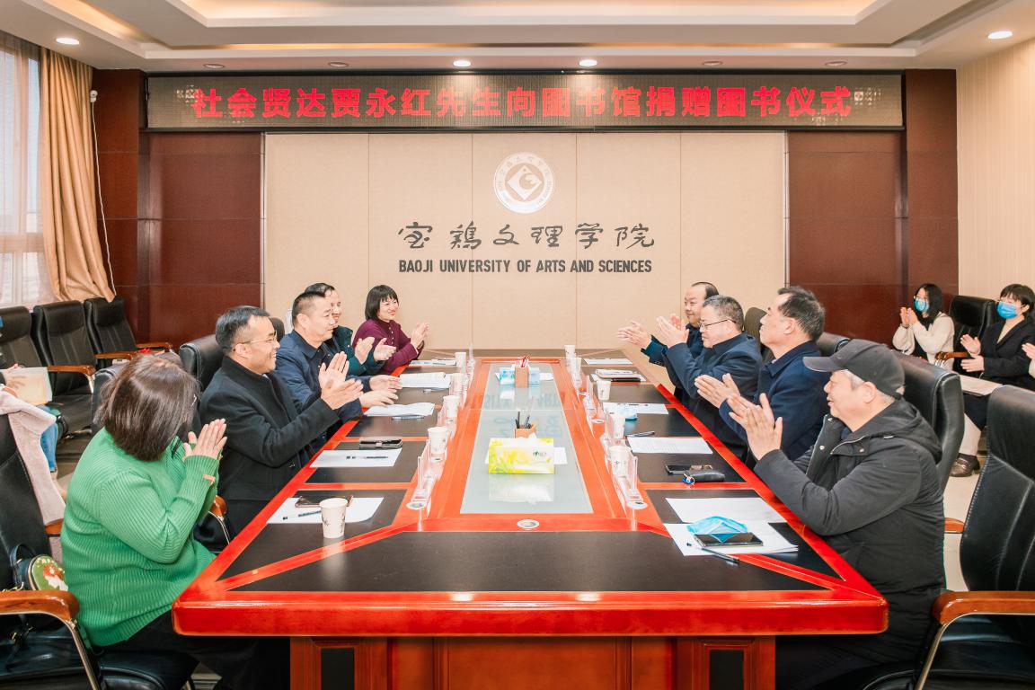 2022年1月12日下午,社会贤达贾永红先生向宝鸡文理学院图书馆捐赠图书仪式在高新校区图书馆806会议室举行。出席捐赠仪式的有校党委副书记栾宏、副校长杨子元。创大办主任赵智劳、校友工作处处长刘景世、图书馆党总支书记、馆长刘崇学、图书馆副馆长刘全定、李华及图书馆职工代表等参加了此次捐赠仪式。捐赠仪式由刘崇学主持。
