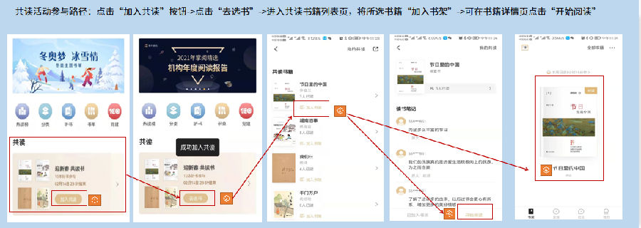 步骤二:点击“加入共读”按钮->点击“去选书”->进入共读书籍列表页,将所选书籍“加入书架”->可在书籍详情页点击“开始阅读”